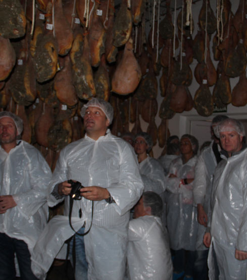 Een grote delegatie van de Vereniging van Nederlandse Meesterslagers heeft een studiereis gemaakt naar Antonio Alvarez Jamones, producent van 100% natuurlijke serranohammen. Het bedrijf is gevestigd in Trevélez, in het zuiden van Spanje in het Alpujarra gebergte, in de regio van Cordoba. Wij kregen daar uitleg over de wijze van productie, de duur en verloop van het rijpingsproces en een smaaktest. Daarnaast brachten wij een bezoek aan een natuurgebied waar de zwarte Iberico varkens vrij leven en zich te goed doen aan smakelijke eikels en gras.